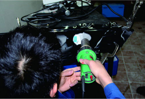 在鋁質面板修復時,也可使用鋁整形機對損傷部位進行拉伸修復,在經整形機修復到位后,使用專用工具將螺紋介子齊根剪下,再打磨平整即可。對于鋼板車身來說,當面板和內層結構同時發生變形時,可以采取內外層分離、分別修整,然后折邊咬合的修復方法。對于鋁質面板,不能使用這種方法,否則由于鋁的韌度較差,折邊部位會出現裂紋或斷裂。