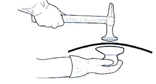 (1)為了降低拱起部位的高度,如果采用正托敲擊法,操作時應多次輕敲,不能重敲,否則錘擊太重或次數過多會使鋁板延展拉伸,如圖1-89所示是正托敲擊法示意圖。