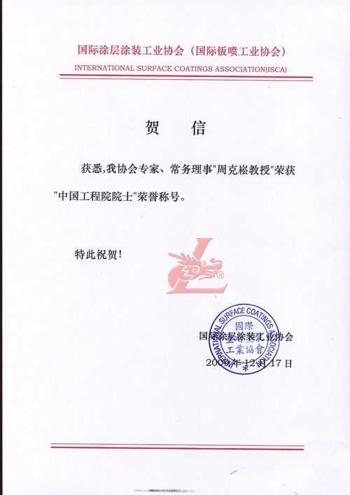賀國際涂層涂裝工業協會專家常務理事克崧教授榮獲“中國工程院院士”[龍神秘書單位處] 賀國際涂層涂裝工業協會專家常務理事克崧教授榮獲“中國工程院院士”[龍神秘書單位處] 珠海龍神有限公司秘書處賀 2009-12-19 8988