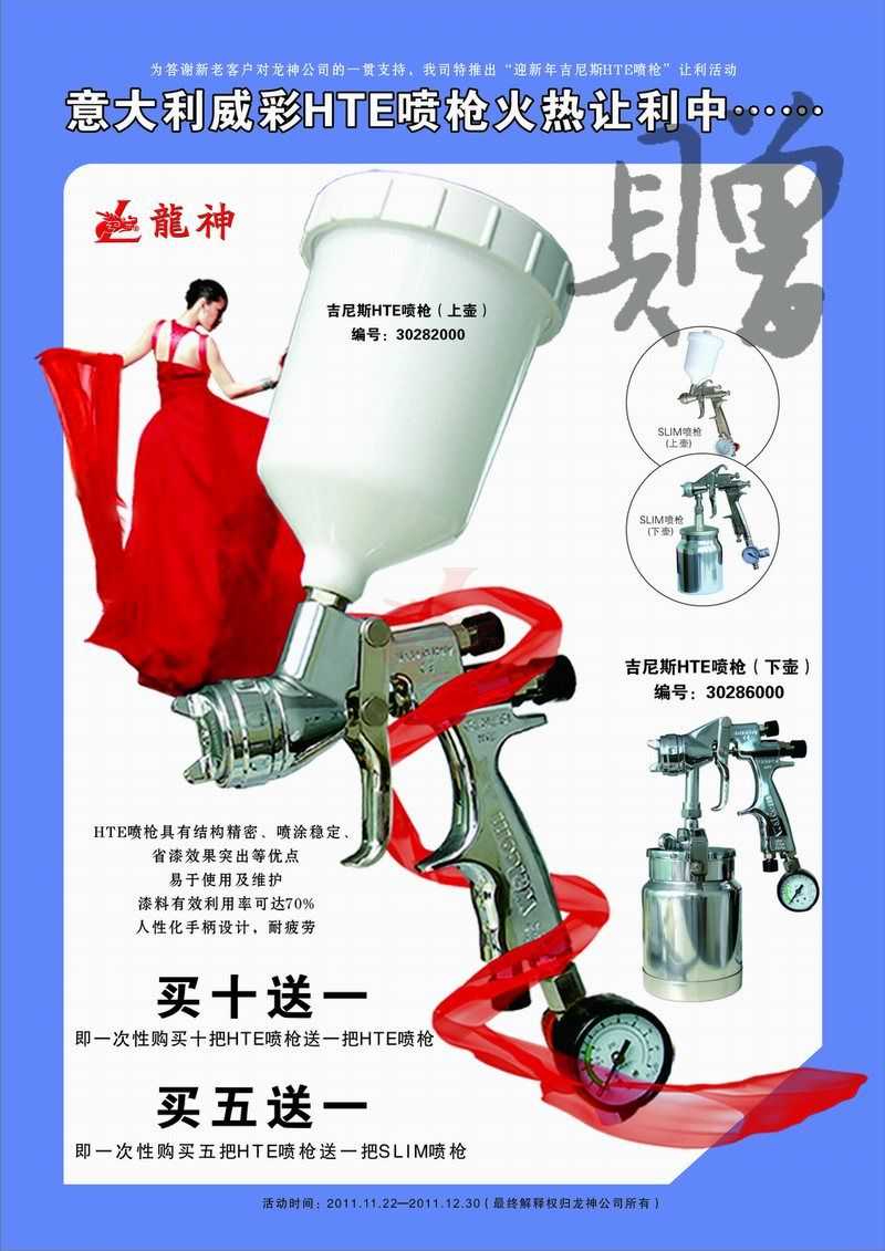 吉尼斯HTE噴槍11月促銷 吉尼斯HTE噴槍2011年11月促銷 (活動已結束,感謝您的關注) 一、主題: 吉尼斯HTE噴槍讓利促銷 二、活動目的: 讓利回饋給力促銷 三、活動時間: 1、 時間:2011年11月21日至2011年12月30日 2、 時長:共計40天 四、活動內容: 1、 買十送一(即一次購買十把HTE噴槍送一把HTE噴槍) 2、 買五送一(即一次購買五把HTE噴槍送一把SLIM噴槍) 市場部 2011年11月17日 宣傳海報 2011-11-19 12772