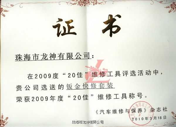 2010年北京汽保春季展期間,由中國汽車保修設備行業協會和《汽車維修與保養》雜志共同舉辦的2009年度“20佳”維修工具頒獎典禮,于2010年3月18日在北京江河水鳥巢麗景隆重舉行,龍神“鈑金快修套裝”在眾多候選產品中脫穎而出,獲得本屆評審委員會專業評委的一致認可:符合產品創新性、實用性、效率性,可幫助企業提高工作效率,授予“中國汽車維修市場2009年度20佳”榮譽稱號。
