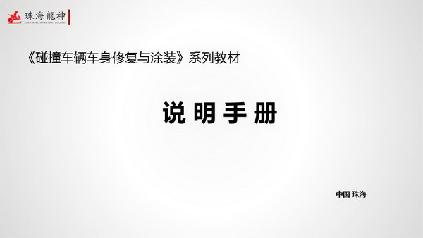 珠海市龍神有限公司2014年隆重巨獻《碰撞車輛車身修復與涂裝》系列教材:基礎篇《車身修復與涂裝基礎和設備配置》、鈑金篇《車身碰撞損傷修復實訓與技能考核》、噴漆篇《車身修補涂裝工藝實訓與技能考核》。