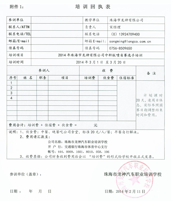 為了響應(yīng)國(guó)家“企業(yè)應(yīng)該積極融入和參與職業(yè)教育事業(yè)”的號(hào)召,讓部分參賽條件和設(shè)施不足的學(xué)校也能參加技能大賽,促進(jìn)全國(guó)中職技能大賽在全國(guó)的快速和均衡地發(fā)展,珠海市龍神有限公司憑借自身20多年的汽車鈑噴行業(yè)經(jīng)驗(yàn)和設(shè)備技術(shù)優(yōu)勢(shì),定于2014年3月1日至3月20日在珠海舉辦為期20天的汽車車身修復(fù)與涂裝技能大賽選手培訓(xùn),具體方案如下: