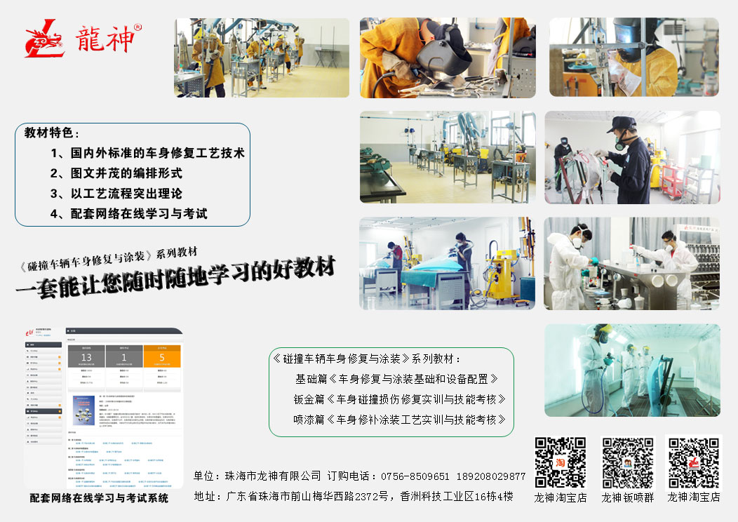 龍神隆重巨獻“汽車鈑金修復與噴漆”系列教學實操教材 2014-07-10 70720 珠海市龍神有限公司2014年隆重巨獻《碰撞車輛車身修復與涂裝》系列教材:基礎篇《車身修復與涂裝基礎和設備配置》、鈑金篇《車身碰撞損傷修復實訓與技能考核》、噴漆篇《車身修補涂裝工藝實訓與技能考核》。 本系列教材,根據國內職業教育的要求,在內容上加強了針對性和應用性,力求把傳授知識點與能力培養有機地結合在一起,突出以能力為本位的職業教育特點,體現理論與實踐相結合的一體式教學模式。本教材教學體系及教學模式先進,文字通俗易懂,插圖清晰直觀。每冊配贈網絡學習、在線題庫??勺鳛槁殬I院校及本科相關專業教材,也可供洗車維修涂裝叢業人員學習和參考。 《碰撞車輛車身修復與涂裝》系列教材,現已啟動全面征訂!