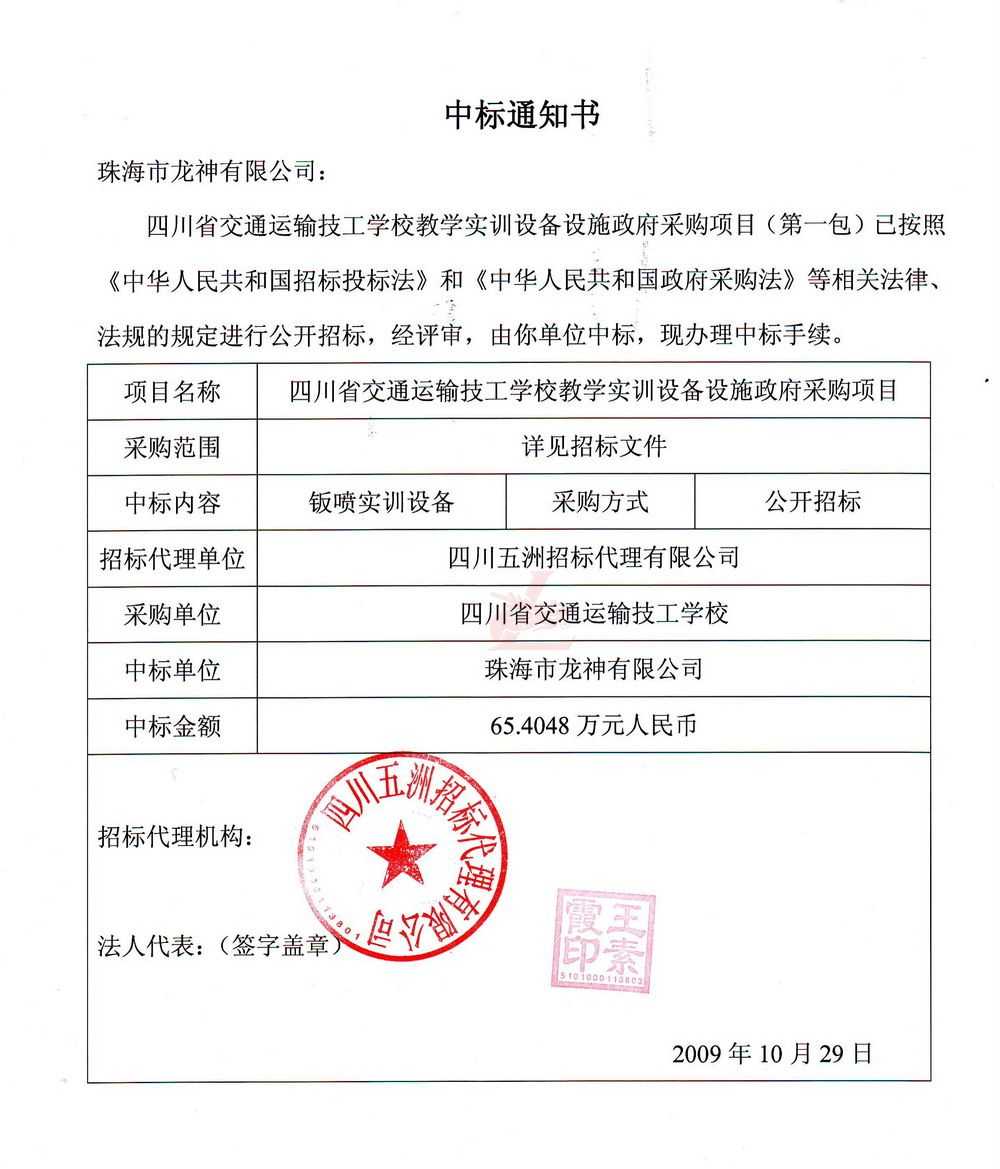 [喜訊]熱烈祝賀龍神成功中標-四川省交通運輸技工學校 [喜訊]熱烈祝賀龍神成功中得四川省交通運輸技工學校標 [新聞中心]珠海市龍神有限公司經過長時間的籌備已成功中得四川省交通運輸技工學校教學實訓設備設施政府采購項目標,這是珠海市龍神有限公司一種實力的表現。說明了珠海龍神的品牌在不斷的加強、深化。 珠海龍神公司一直專業、效率、服務、環保。同時“龍神”在創新中求發展,在發展中求創新的原則。 (中標通知書,點擊放大圖) 2009-11-06 9081